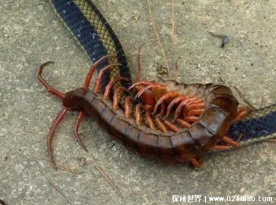 蜈蚣和蛇两个动物就是天敌的存在,蛇一旦见到蜈蚣,想也不想的就会一个不落地统统吃掉,不过蛇也有可能被蜈蚣咬死,这就要看双方的战斗力了。