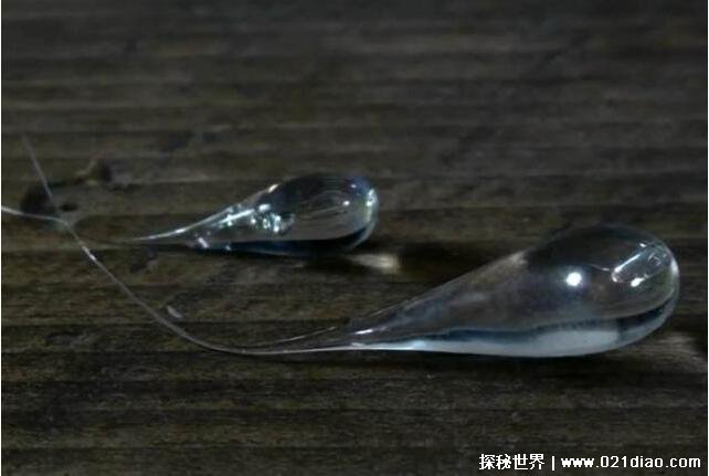 鲁伯特之泪就是把高温融化后的液态玻璃玻璃靠重力自然滴入冰水中,就会形成这些蝌蚪状的“玻璃泪滴”。被俗称为“鲁珀特之泪”的这种玻璃有着奇妙的物理特性:泪珠本身比一般玻璃坚硬很多,能在20吨压力下不碎。