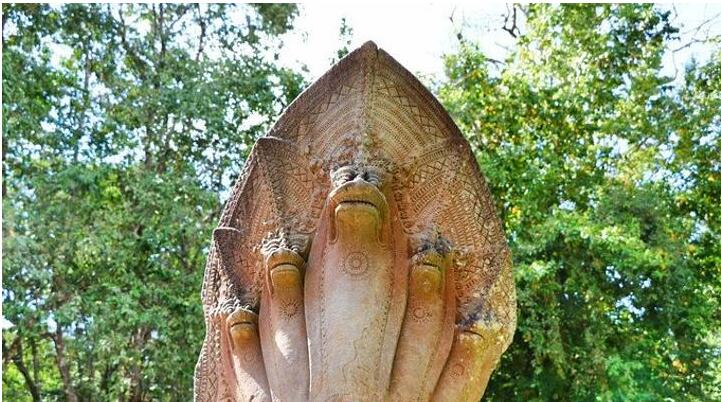 蛇在中国的传统文化里是邪恶的化身,是恶魔的化身,而在柬埔寨,七头蛇神被视为柬埔寨国家起源的神圣象征和王国兴盛的保护者,在许多古代遗址和现代庙宇中都有五头蛇神或者七头蛇神的雕塑和建筑。而据说在印度神庙就有五头蛇存在,还传出了照片。