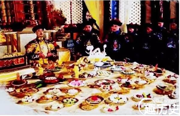 乾隆帝这顿平常的晚膳,用了各式菜汤二十余品,餐具用珍贵的金、银、珐琅、瓷等碗盘碟匙,而且几种名菜都要特命名师承做。就在同一天的霁红盘酒膳一桌中,十五品菜,其中有四品就是著名厨役张安官承做的。但是在乾隆皇帝用膳时,感到四品菜不像张的手艺,马上命令小太监传旨,令厨役张安官再亲自做菜一品呈上,于此可见皇帝口味之高,要求之严。