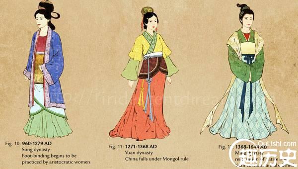 宋代的丝织手工业较为发达,主要品种有锦、绫、纱、罗、绮、绢、缎、绸等等,当时的临安、苏州、扬州等已经是丝织业的主要产区。丝绸印染工艺的发展和提高,使得当时的服装面料色彩丰富,装饰华丽。女性使用的抹胸,一般用罗绢做成,上施彩色图案,非常妩媚亮丽。