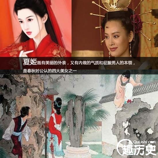 夏姬既有美丽的外表,又有内敛的气质和征服男人的本领,是春秋时公认的四大美女之一。夏姬比较完整的故事记载于先秦的典籍《左传》、《列女传》、《谷梁》中。在《诗经》和《国语》中都有所补充或印证,《史记》、《资治通鉴》更是言之凿凿,记叙犹详。她的姿容仪态,绝对是美艳不可方物。大凡物极而必反,美极而近妖,因此,“公侯争之,莫不迷惑失意”。难怪历代文人要把红颜比作祸水了,而朴素的民间则有另类说法:“英雄难过美人关”。万法归宗,其意一也:就是美丽的容颜,绝对有超强的倾城倾国的杀伐威力。