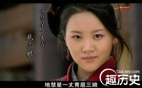 梁山好汉中上山时是未婚女性的只有“一丈青”扈三娘,扈三娘是一个花季少女,她有一个幸福的家庭,是卧龙岗上扈家庄的大地主扈太公的掌上明珠,许配给青梅竹马的祝家庄祝彪为妻,祝彪不仅武艺高强,还一表人才,和扈三娘是天生的一对,让扈三娘背地里偷喜。扈三娘的诨名叫"一丈青"。只从字面解释,可以断定扈三娘是个细高挑儿的姑娘,而且还是美女。后文扈三娘出征,认旗上不写"一丈青扈三娘",而写"美女扈三娘",就是明证。在战场上居然打出"美女"的旗号,古往今来,大概也只有她一个