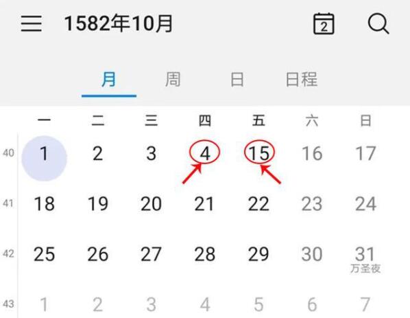当你去翻看万年历的时候你会惊奇的发现在1582年的10月份竟然整整少了10天,也就是说这个月只有21天,从日历中可以看出这个月4号过完之后就直接15号了,这中间的十天究竟哪里去了,1582年10月消失的十天发生了什么,为什么会少了整整十天,让我们来一探究竟。