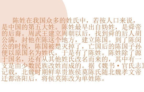 而到了后来,陈国发生了内乱,陈国的后人跑到了齐国,称呼自己为陈氏。到了这里,陈姓就可以确定下来了,慢慢的当时很多陈国的人就用陈作为了自己的姓氏。而到了后来更是有很多的少数民族或者是其它姓氏改了自己的原本姓氏,也成为了陈氏。这其中就有刘氏,白氏,侯莫陈氏,女真族陈氏等等。