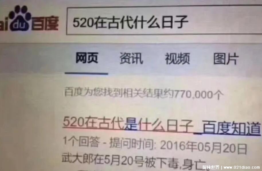 其实这个梗是来自于网友的一张图,说520在古代是什么日子,下面的回答是武大郎被毒死的日子,可能大家都比较怨恨这种行为,加上一些单身狗网友并没有对象,因此就有非常多人把这张图片拿来调侃,也因此武大郎被毒死在520的说法也就流传开了。