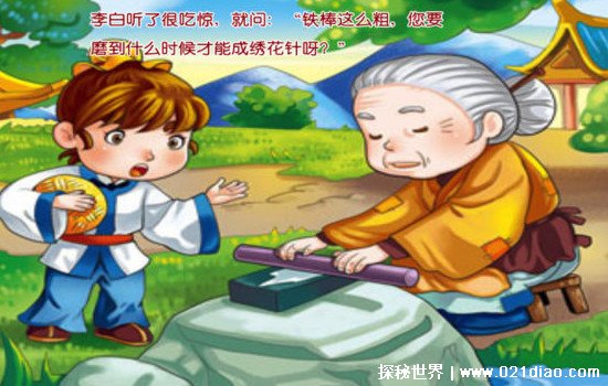 故事简单来说讲的就是李白年轻的时候不怎么喜欢学习,一次在回家的路上看见一位老奶奶在用一根铁棒在石头上反复打磨,李白很好奇,问了之后才知道老奶奶是在打磨一根绣花针,李白很疑惑,这根铁棒怎么可以打磨成绣花针了,老奶奶说只要我有毅力,日复一日的坚持下去就可以了,李白从中受到启发开始发奋努力的读书终于成就了自己。