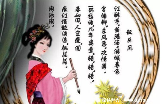 陆游是宋朝时期的一位十分有名的才女,而他娶的第一任妻子唐婉也同样十分有才华。两人结婚之后一直都是十分恩爱,但是陆游与唐婉的这段爱情故事结局却十分凄惨。由于唐婉婚后没有及时生育被陆游的母亲强迫休掉了,两人十几年后再见不觉感慨万分,分别做出了两首流传千古的《钗头凤》。