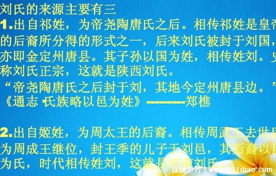 在中国,姓氏有着几百种,每一个姓氏都有着自己的来源于历史,今天就来聊一下刘姓的来源和历史名人。这个姓氏无疑是人数众多的,在2013年的数据中表明,这个姓氏的人数已经有了7000万,那么现在肯定又是增加了不少。根据历史记载,刘姓来源于尧的后裔刘累,也就是说刘累是刘姓的始祖。