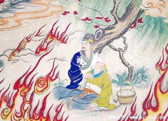可是山峦重叠,根本找不到,于是放火烧山,相信作为孝子的介子推会背着母亲出来。没想到火蔓延数十里,连烧三日不熄,介子推还是没有出来。最后火熄灭后进山寻找,才发现介子推和他的老母亲抱在一起,被活活烧死了。于是人们就将放火烧山这天定为寒食节,严禁烟火,只吃寒食。
