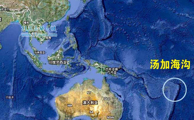 在太平洋中南部汤加群岛以东(南纬22度0分,西经173度0分),北起萨摩亚群岛,南接克马德克海沟,全长1375公里,宽约80公里,平均深6 000米,最深达10 882米。