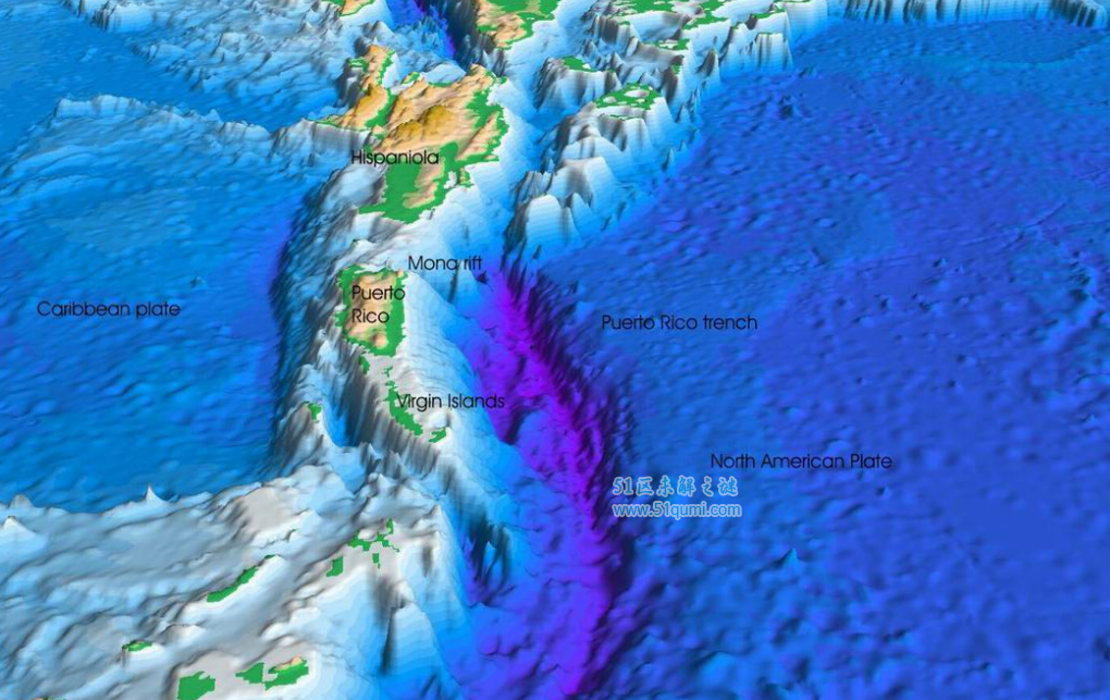 波多黎各海沟是一个在大西洋与加勒比海之间的海沟,最深处9219米(即30246英尺〕。此海沟与两个地带的相互作用有关。一个是沿着小安的列斯群岛的火山岛弧向南的隐没带;另一个地带是一个主要的转换断层或板块边界区域,位置在古巴与伊斯帕尼奥拉岛之间,穿过开曼海沟直至中美洲岸边。科学研究得出如果在断层沿线发生地震可以产生显著海啸的结论。