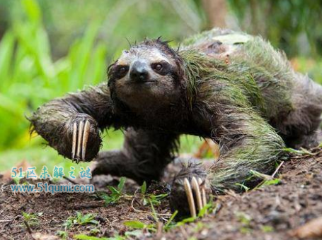 树懒主要分布在南美洲,终年栖居树上,用爪钩住树枝倒挂身躯,是世界上最慢的动物之一,它们的移动速度在3-6.7厘米每秒。