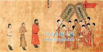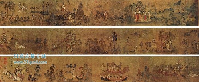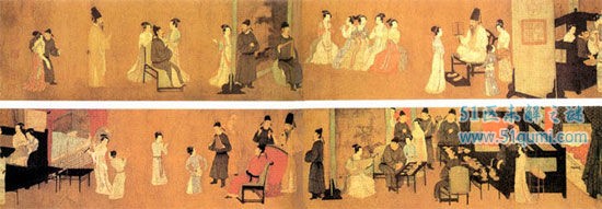 五代·顾闳中《韩熙载夜宴图》,北京故宫博物院馆藏珍品。绢本纵28.7厘米,横335厘米。是五代大画家顾闳中所作,以连环长卷的方式描摹了南唐巨宦韩熙载家开宴行乐的场景。用笔细润圆劲,设色浓丽,人物形象清俊、娟秀,栩栩如生而名闻中外。是今存五代时期人物画中最杰出的代表作。这幅画卷不仅仅是一幅描写私人生活的图画,更重要的是它反映出那个特定时代的风情。《韩熙载夜宴图》从一个生活的侧面,生动地反映了当时统治阶级的生活场面。画家用惊人的观察力,和对主人公命运与思想的深刻理解,创作出的这幅精彩作品值得我们永久回味。