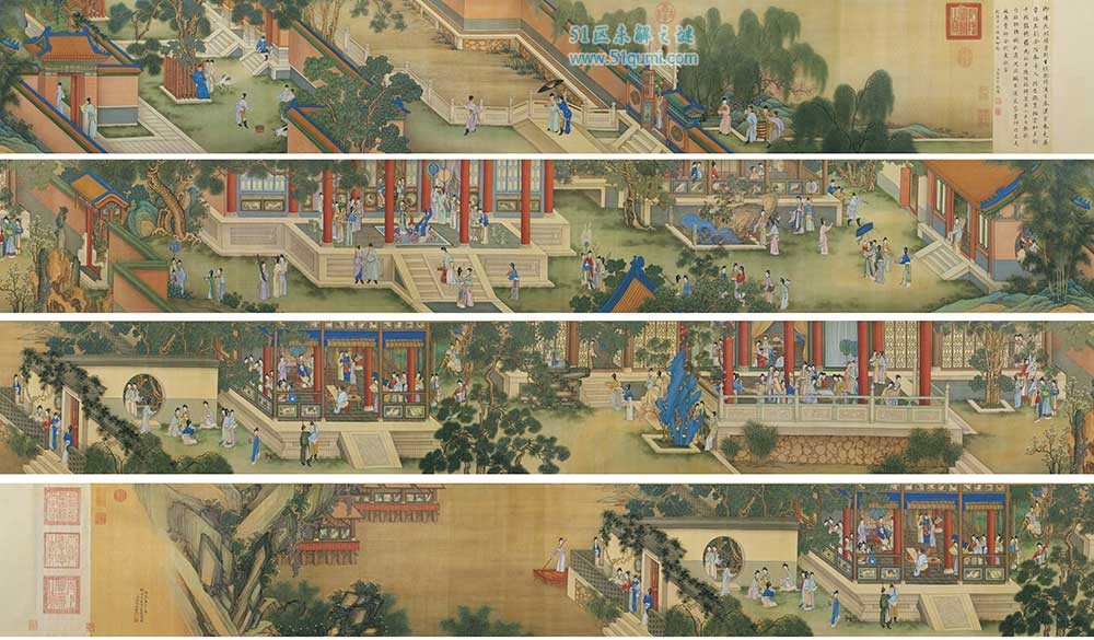 明·仇英《汉宫春晓图》,现藏台北故宫博物院。是中国重彩仕女第一长卷。绢本重彩,尺幅很大,37.2cm×2038.5cm,作为装饰性绘画来说属于巨制。汉宫春晓是中国人物画的传统题材,主要描绘宫中缤妃生活。仇英是明代有代表性的画家之一,在绘画上以“重彩仕女”著称于世,《汉宫春晓图》是仇英重彩仕女画的杰出代表。此图勾勒秀劲而设色妍雅,画家借皇家园林殿宇之盛,以极其华丽的笔墨表现出宫中嫔妃的日常生活,极勾描渲敷之能事。不仅是仇英平生得意之作,在中国重彩仕女画中也独树一帜,独领风骚。
