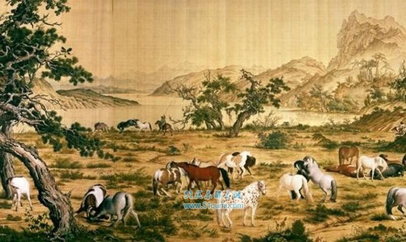 清·郎世宁《百骏图》,纵102厘米、横813厘米,现藏于台北故宫博物院。意大利人郎世宁1715年他以传教士的身份远涉重洋来到中国,就被重视西洋技艺的康熙皇帝召入宫中,从此开始了长达五十多年的宫廷画家生涯。在绘画创作中,郎世宁融中西技法于一体,形成精细逼真的效果,创造出了新的画风,因而深受康熙、雍正、乾隆器重。《百骏图》是他的代表作之一,此图描绘了姿态各异的骏马百匹放牧游息的场面,全卷色彩浓丽,构图复杂,风格独特,别具意趣。奇闻呀 wWW.QIWenyA.cOM