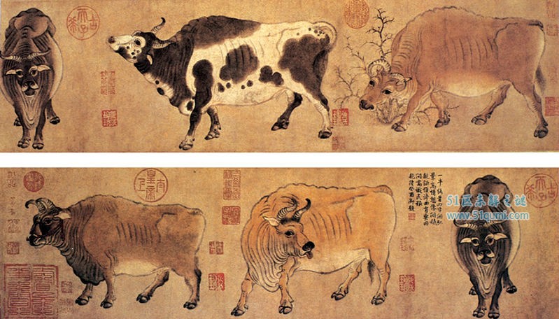 唐·韩滉《五牛图》,北京故宫博物院馆藏珍品。麻纸本,纵20.8厘米,横139.8厘米,无款印。它问世后,收藏者包括赵构、赵伯昂、赵孟頫、乾隆等著名人物。在明代,它几易其主。清兵入关后一度下落不明,直到乾隆年间,才从民间收集到宫中珍藏。1900年,八国联军洗劫紫禁城,《五牛图》被劫出国外,从此杳无音讯。上个世纪50年代,它被一位寓居中国香港的爱国人士发现。《五牛图》回到故宫时,画面洞孔累累,残破不堪。故官博物院组织专家,用了几年时间,才将它修复完好。让今人有幸看到这幅《五牛图》,其用笔之细,描写之传神,牛态之可掬,几可呼之欲出。它的珍贵还在于,中国古代留存今世的多为花鸟人物,以牛入画,且如此生动者,《五牛图》堪称孤品。