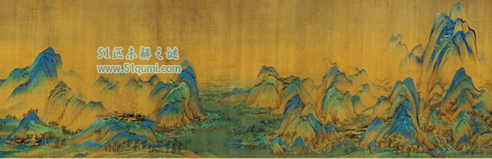 北宋·王希孟《千里江山图》,北京故宫博物院馆藏珍品。绢本,设色,纵51.5厘米,横1191.5厘米, 为中国北宋青绿山水画作品。作者王希孟。王希孟18岁为北宋画院学生,后召入禁中文书库,曾得到宋徽宗赵佶的亲自传授,半年后即创作了《千里江山图》。全图刻画工细,水面满勾峰头纹,无一笔懈怠,虽然不似金碧山水那样勾金线,却依然感觉满幅富丽堂皇,这也就是此图较之前唐的青绿山水更趋成熟之处。