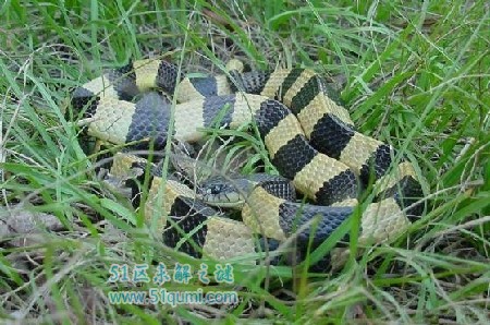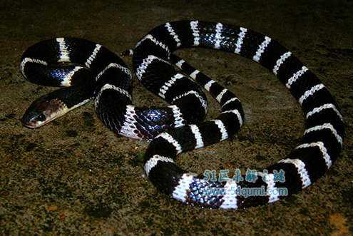 银环蛇,属于蛇目眼镜蛇科环蛇属的一种。俗称过基峡、白节黑、金钱白花蛇、银甲带、银包铁等。头椭圆形,全身体背有白环和黑环相间排列,白环较窄,尾细长,体长1000~1800 mm,具前沟牙的毒蛇。背面黑色或蓝黑色,具30~50个白色或乳黄色窄横纹;腹面污白色。头背黑褐,幼体枕背具浅色倒"V"形斑。背脊较高,横截面呈三角形,尾末端较尖。头椭圆形,与颈区分较不明显,关背具典型的9枚大鳞片,无颊鳞,背正中一行脊鳞扩大呈六角形,尾下鳞单行。