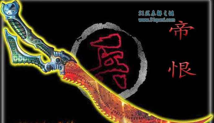 帝恨是一把与邪帝颇有渊源的兵刃,最早的独孤星夜双目被火魂灼瞎引发天魔分身意识回归,就是帝恨的杰作。当年西周伐商。纣王兵败逃回鹿台。举火自焚,并在临死前对姬发许下了最恶毒的诅咒。果然,后来姬发没活过40岁。而天魔的十颗魔珠正好有一颗被纣王的怨恨情绪感召,破土而出。它以纣王的衣冠铠甲为物质,融合了纣王的血肉和无边怨毒,形成了刀型魔兵——帝恨。而且由于自焚时纣王的怨恨还召唤出商朝的前29位帝王的魂魄。因此帝恨其实代表了大商朝30位帝王对姬发家族的仇恨和怨毒。由此,帝恨表面有30个小齿,每一个代表一代商朝帝王的火魂。平时火焰为黄红色,威力至高时火焰会进化为蓝色。魔兵本性阴邪。帝恨就能利用对方的怨恨和薄弱意志,反过来操控持刀人。后人描述:帝中有恨意,怨附君三十,烙铸成魔兵?