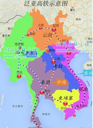 其实泛亚高铁是一个网络,至少可以分东线、中线、西线,如果全部建成,可以将“印度支那”地区全部打通。其中西线也可以大大缩短中国的能源通道,让石油运输不经过、少经过马六甲海峡。