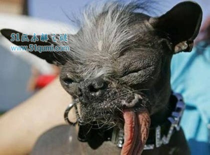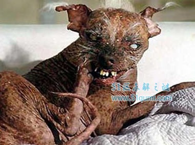 诡异的山姆既像被生化武器摧残过的丑鬼,又像在暗无天日的地下室里守候千年的恶狗。但实际上,它只是一条长相惊人的中国冠毛犬而已。由于长着非同一般的丑脸,山姆在2005年美国加州举办的“世界最丑狗”竞赛中当仁不让地夺魁,此时它已在这个比赛中蝉联3届冠军了。不幸的是,14岁的山姆因一直遭受病魔缠身,在2005年11月死于癌症。