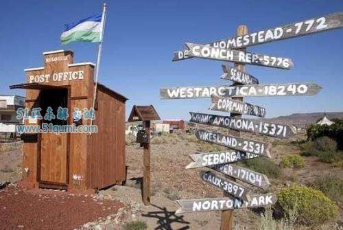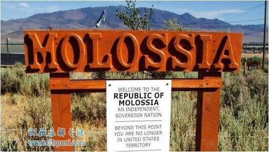 摩洛希亚共和国领土文件:Molossia - Border with United States位于和谐省的边界标记,总面积5.8公顷,由三栋物业组成。和谐省位于内华达Dayton近郊一带,小于4000平方米,是领土当中最小的一块。它也是鲍一家人的居所,首都埃斯佩拉所在。受保护领地新安特里姆位于宾州的一处非公开场所,面积3.2公顷,是摩洛西亚最大面积的领土,其名是纪念北爱尔兰安特里姆郡,总督为赫斯大海军上将,现已废弃并归还予宾州。蝴蝶殖民地则位于北加州,于2003年8月购入,在2005年继承沙漠农庄省后售出。沙漠农庄省位于南加州,本来属于鲍的父亲,另外还声称金星上有一块面积49981平方千米的属地,名为宵星。奇闻呀 wwW.QiwENyA.CoM