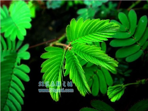 含羞草学名为“Mimosa pudica”,图中这种繁星点点状的粉红色小花就是含羞草的花,图下部则是它的叶子。当人们用手触摸它时,甚至只是向它吹口气,它的叶子就会收缩起来,似乎受到了惊吓而做自我保护。当含羞草受到外界干扰时,它们的茎部会释放出一种化学物质。这种化学物质会迫使水份流出细胞,使得叶子看起来像是萎缩了一样。对于含羞草为什么会进化出这种特性,科学家们至今未能找到明确答案,他们认为这可能是用于威吓捕食者。