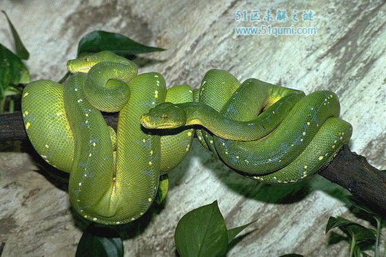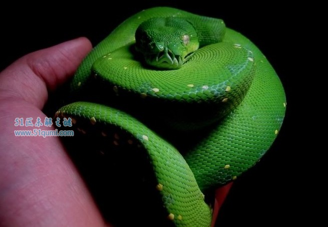 绿树蟒,产于新几内亚,印度尼西亚和澳大利亚北部,是一种树栖夜行性的小型蟒蛇,绿树蟒具备彻底的树栖性,平常大都逗留在树上,体色是单纯鲜明的绿色。虽然是蟒蛇,但是这个品种的体长鲜少会超过1.8米,算是蟒蛇中相当袖珍的品种。由于绿树蟒适中的大小,华丽的体色和独特的习性,使得这个品种一出现在市场上就受很多宠物迷的追捧。