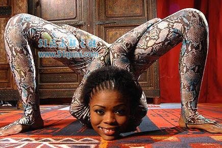 现年18岁的南非女孩巴斯利兹先天柔韧性极好,9岁时参加了美国的巡游马戏团,并成为该团“非洲之星”。由于她每次登台时,总是身穿蛇皮套装,并且将身体随意扭曲折叠,状似“无骨人”一般,观众送给她一个“蛇女”的称号。6年后,这位来自南非的小女孩参加了美国的一个巡游马戏团,现在已经成了该团的“非洲之星”。每次登台时,她总是身穿蛇皮套装,伴随音乐的节拍将身体随意扭曲折叠,仿佛“无骨人”一般做出种种令人瞠目结舌的姿势。