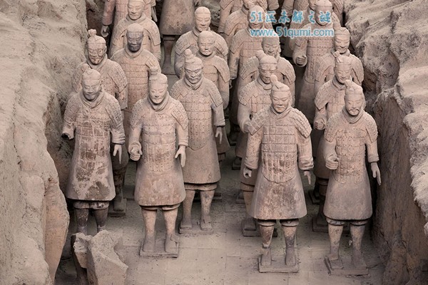 秦始皇兵马俑位于西安附近,是秦朝第一个皇帝秦始皇之墓。据估计三个坑一共有8千名栩栩如生的士兵、130量战车、520匹马和150名骑兵。虽然有的武器被偷,也有较大的褪色,但是它们的存在依然是当时劳动力和技术的有力证明。