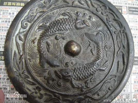 近年来,有的学者从自然生态方面考察,使双鱼铜镜的研究有了突破性的进展,乍看,铜镜上的双鱼没有什么不同,仔细观察或用尺量一量,不难发现鱼头、鳞、身、尾的长短都存在着差异,普遍是一条稍大、一条稍小。据有关鱼类研究资料表明,同龄鲤鱼、草鱼等,雌性肥大、雄性瘦小,由此可知,双鱼一雌一雄。两条鱼在这圆圆的铜镜里环绕着镜钮,永不停息地相互吸引,相互追逐。