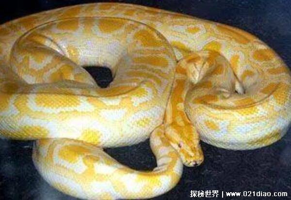 黄金蟒是缅甸蛇的白化突变种,非常稀少,最长可以大概到7米长,分布在印度、缅甸等地区,因为是变异种所以在野外很难生存,所以在世界各地会有很多人当宠物养,虽然性格比较温和但依旧有攻击性。