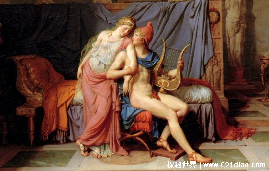 这幅画其实有一个经典故事,在西方神话中,帕里斯是特洛伊的王子,而海伦则是斯巴达国王的王后,但是帕里斯在见到海伦之后就被海伦迷住了,海伦同样也是这样,帕里斯不顾海伦已经是有夫之妇带走了海伦,但是没想到这却迎来了一场战争,那就是特洛伊之战。这幅画描述的就是帕里斯和海伦的缠绵。