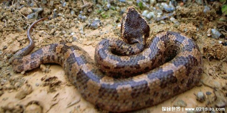 这也是一种小型毒蛇,主要栖息在山区的森林里,经常会藏于枯枝败叶下,而且红棕色的体色会让其看起来很像叶子,不容易辨认。虽然毒性很强,但是很胆小,也不会主动攻击人,不小心踩到它了它也只会逃跑。