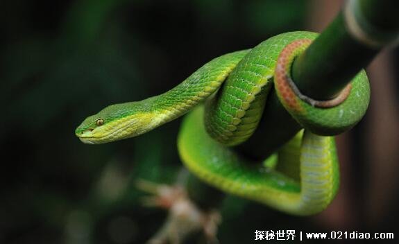 竹叶青全身为绿色,除了在绿叶间,在其他地方还是非常容易分辨出来的,不过它经常会悬挂在树上,让人难以分辨,不过好在毒性很小,被咬了只是很痛,而且肿胀,并不会致命,所以在野外穿梭的生活还是注意一点为好。