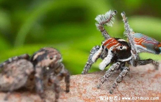 首先要说明一点,孔雀蜘蛛并不是真正的孔雀,而是一种蜘蛛。它之所以会被称为孔雀蜘蛛是因为它也可以开屏,而且开屏的颜色艳丽程度超过了孔雀。当然了这种开屏并不是真正意义上的开屏,而是由于它不断的摇动自己的腹部造成的,它的腹部有着绚丽的颜色。这种蜘蛛颜色虽然绚丽,但是却含有剧毒,因此被戏称最恐怖的孔雀。