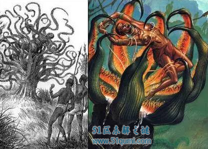 食人柳,外形与柳树近似,长有许多长长的枝条,有的半垂在空中,有的拖到地面上,就像一根根断落的电线。据说这种奇怪的树生长在印度尼西亚的爪哇岛上,行人如果不注意碰到它的枝条,枝条就会马上把人紧紧卷起来,使人难以脱身,仿佛被无数根绳索绑住一般。接着,枝条上分泌出一种极黏的消化液,牢牢地把人粘住、勒死,并消化皮肤、肌肉,直到将人体中的营养吸收消化完,枝条才重新展开,而地上往往只留下一堆白骨。