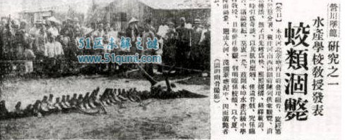 据几位老人讲,当年有关方面曾邀遍老渔民辨认,但没一个人认识怪物尸体。人们议论纷纷,普遍认为是“龙”。 营口伪第六jing察分署组织人力,将其尸骨分解后运到南岸,在西海关前空场上按原状摆放,任人参观。