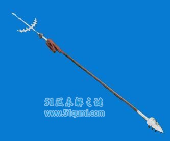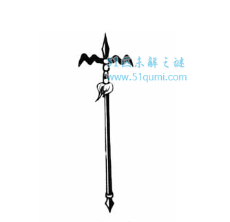 凤翅镏金镗,形似马叉,上有利刃两面出锋,正锋下有两股,向上弯翘,其形状异常,可刺可防,属长兵器。锋刃用铁,柄为木制。在镗的中yang部位是它的正锋,如长枪的枪头。正锋是以刺为主要功能。正锋两侧向上弯翘的锋刃不但可以攻击敌人,同时又可进行有效的防御。由于镋的形状特殊,还常充当火箭发射架使用,时远距离敌人进行杀伤。明代戚家军中镋手便每人配有火箭30支。镋虽然是一件攻守兼备的武器,但由于正锋及两侧向上弯翘部分大且重,整件兵前重后轻,比例严重失衡,只有臂力较好的兵士才能使用。