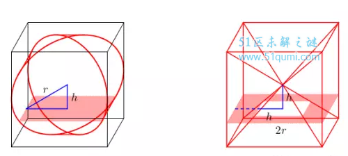 上面右图是一个正方体挖去了两个四棱锥(这两个四棱锥分别以上下底面为底面,以正方体的中心为顶点),设正方体边长为2r。以平行于底面的平面同时截“牟合方盖”和“右图的几何体”,所得截面如上图所示。左图的截面是一个正方形,设中心到截面的距离为h,可得该正方形边长为2√r²-h²,所以左图的截面面积为4(r²-h²)