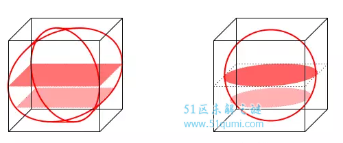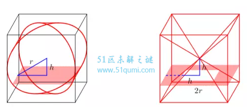 右图的截面像一个正方环形,面积是大正方形的面积减去小正方形的面积,边长为2r,所以大正方形面积为4r²,同样设中心到截面的距离为h,可知小正方形的边长为2h,所以小正方形的面积为4h²,即截面面积为4r²-4h²。