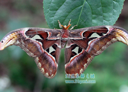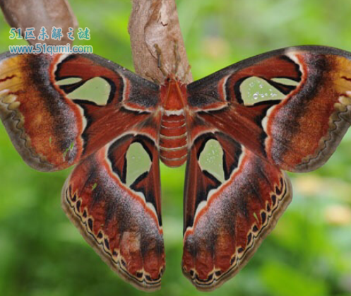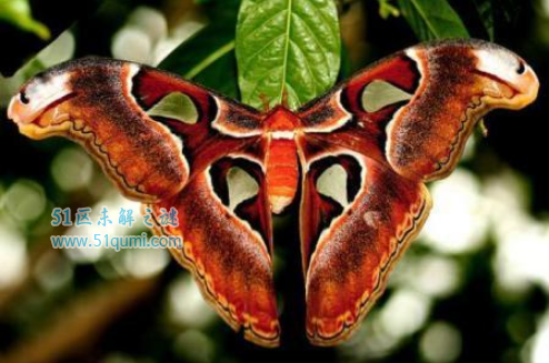 乌桕大蚕蛾,是鳞翅目大蚕蛾科的一种大型蛾类,也是世界最大的蛾类,翅展可达180-210毫米。雄蛾的触角呈羽状,而雌蛾的翅膀形状较为宽圆,腹部较肥胖。其翅面呈红褐色,前后翅的中yang各有一个三角形无鳞粉的透明区域,周围有黑色带纹环绕,前翅先端整个区域向外明显地突伸,像是蛇头,呈鲜艳的黄色,上缘有一枚黑色圆斑,宛如蛇眼,有恫吓天敌的作用,因此又叫做蛇头蛾。这种蛾类十分珍贵,数量稀少,属于受保护的种类。