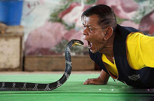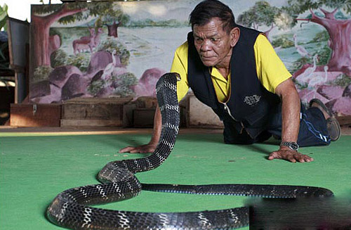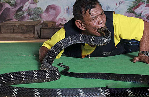 有一个解释,就是说眼镜蛇对远处的目标特别是活动的目标特别敏感,而对近距离的目标特别是不动的目标不敏感,也就是说眼镜蛇的眼睛有问题,耍蛇人正是利用了这一点才敢去亲吻它的。