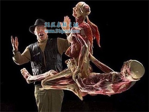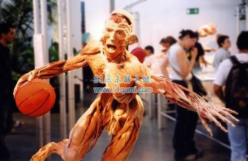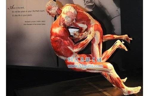 一切的工作结束以后,在冷冻状态下,用锯把尸体切成3.5mm厚的切片。人们可以通过这些切片区别受损与正常的器官,如吸烟的肺与正常肺的区别;脂肪肝与正常肝脏的区别等。在切片完成后,就会做成各式各样的造型。此时的人体标本的肌肉,干而涩,没有一点弹性。一根根红色血管及肌肉组织清晰可见。啧啧,脑海中已经想到那样的画面了。