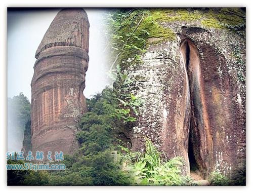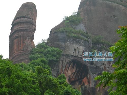 阳元石:位于广东省仁化县丹霞山风景区,锦江之西、玉女峰旁,高28米,直径7米,酷似男性勃起的生殖器,孤峰顶立,仰天高耸,直傲苍穹,似要向玉女宣示阴jing的宏伟。