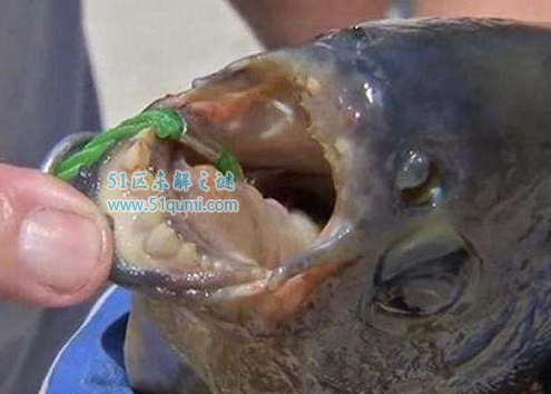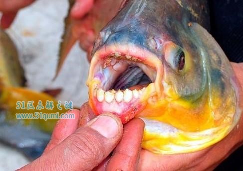 锯腹脂鲤,属于食人鱼的一种,但一般只吃落入水中的成熟果实和坚果。最大能长到90厘米长,25公斤,主要生活在亚马逊盆地流域和奥里诺科河盆地。而在巴布亚新几内亚和美国的几个州,也都发现过这种鱼的踪迹。锯腹脂鲤与食人鱼的长相很类似,几乎无法从外观上区分,但两者的牙齿不同,锯腹脂鲤的牙齿较平和有力,更适合碾碎食物。
