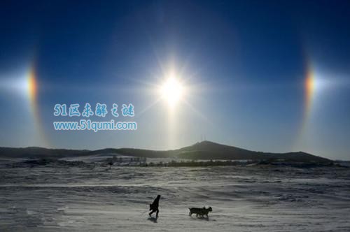 幻日是天空同时出现三个太阳的一种奇异的现象。在天空出现的半透明的薄云里面,垂直地悬浮着许多细小的正六角形冰柱,偶尔它们会整整齐齐地垂直排列在空中,就会发生非常规律的折射现象.光线从冰柱的一个侧面射入,又从另外两个侧面射出,产生了反射和折射.这三条光线射到人的眼睛中。所以反映不出多个太阳的奇景,而六角形冰柱有规则排列在天空中的情况极少出现,因此,这种三日同辉的大气光学现象就极为罕见了。