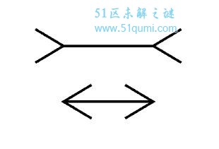 缪勒-莱尔错觉几何图形错觉的一种。缪勒-莱尔1889年提出。两条原本等长的线条因两端箭头的朝向不同而看起来箭头朝内的线条比箭头朝外的线条要短些的现象。其原因可能是箭头朝外使线条所占空间大,而使该线条似乎延长了,相反箭头朝内则使该线条产生收缩感。