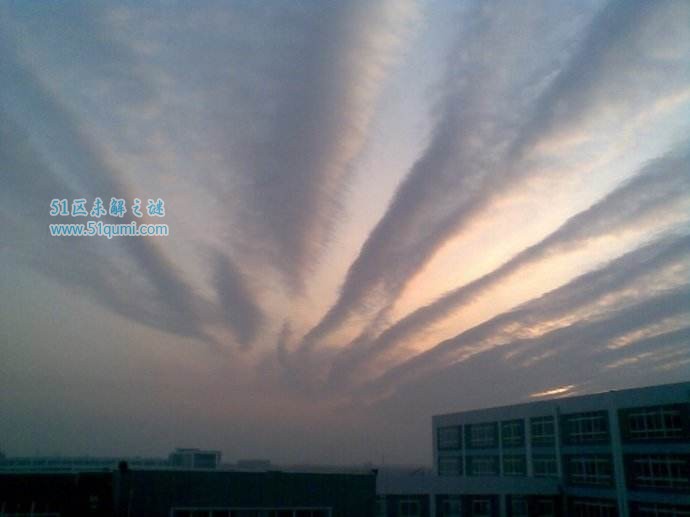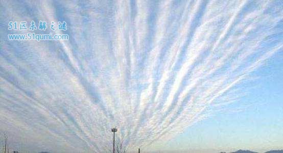 2、多条震云:成平行或者放射状的云,对于平行的多条云,又称“排骨云”,现观测多为本地地震;而现有观点认为放射状云的震中是其成弧指向的圆心。这两种云一般预示着2~6天以后的地震。